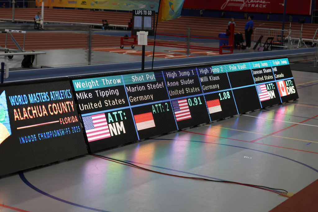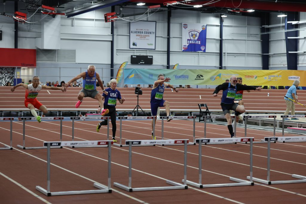 Monday morning saw multiple competitions in two locations. At 9AM, the Men’s and Women’s Indoor Pentathlon continued at the Alachua County Sports and Events Center with Women’s 70+ and Men’s 60 categories starting the day. The Men’s 60m heats and Women’s 60m finals followed. The Men’s Shot Put and Women’s Weight Throw also got underway at 9AM. At 3:30PM the Men’s and Women’s 800m finals started. At West End, at 9AM, the Outdoor Throws commenced with Men’s and Women’s Discuss, Javelin and Hammer.